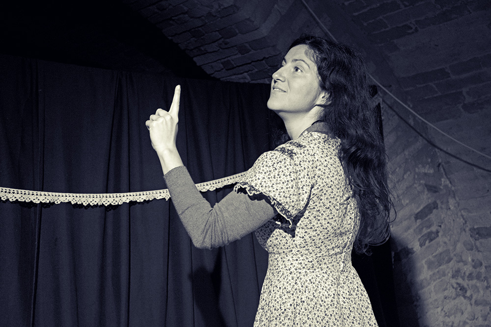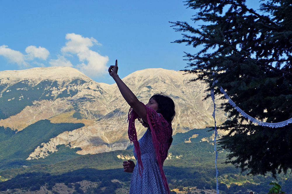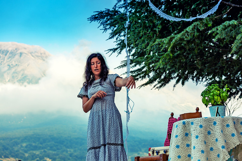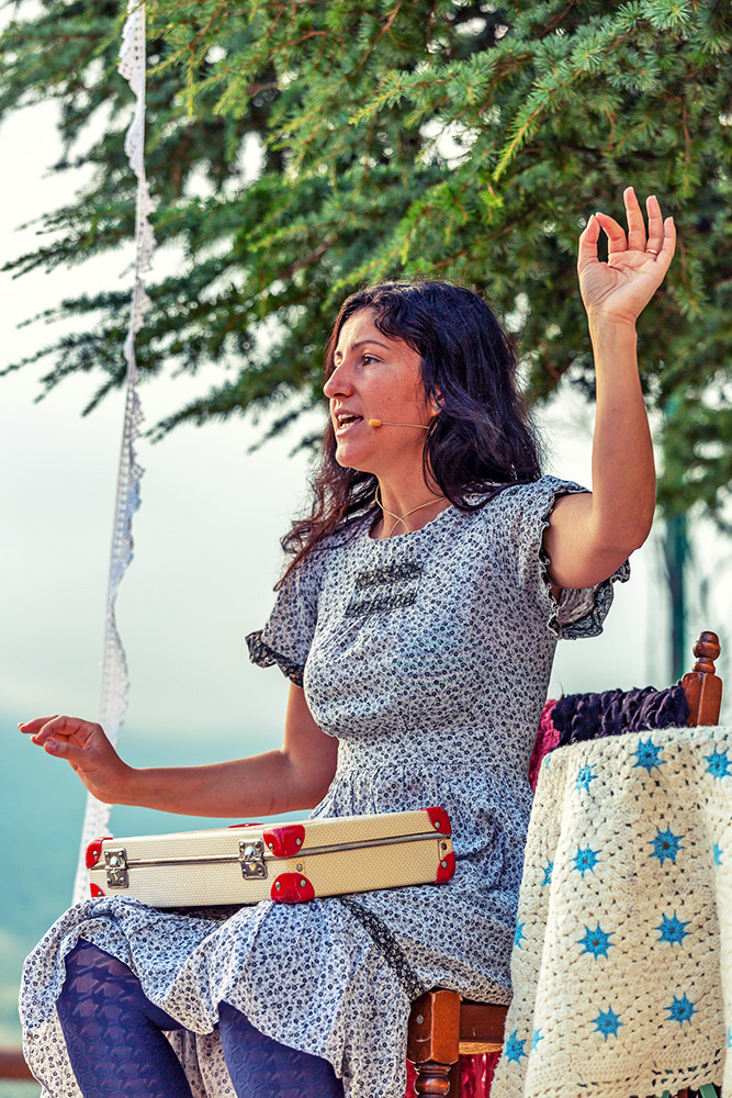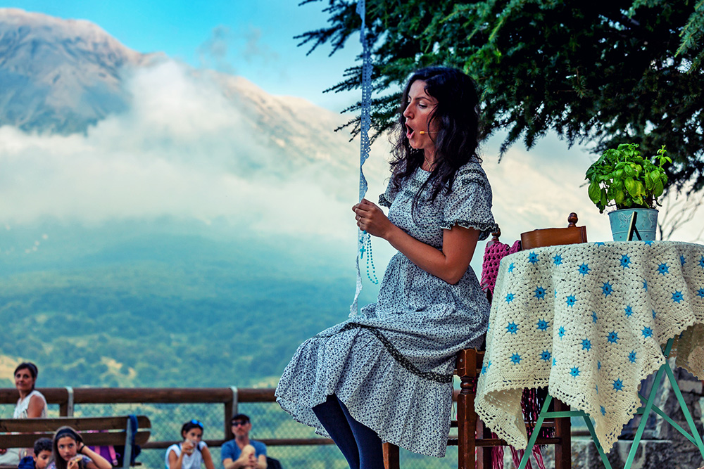 La voce dell´attrice, sembra venire da lontano, snocciolando vicende al ritmo dei passi scalzi di quelle donne che, per lavoro, attraversavano i sentieri delle montagne abruzzesi, Montagne che diventano esse stesse personaggi di quelle storie, silenziose confidenti, accoglienti spazi per ritrovarsi, gigantesse imponenti e protettive. I canti e i racconti di queste donne, depositarie di memorie che si fanno fiabe, creano la magia di uno spettacolo che si trasforma in occasione di incontro e di intima condivisione.