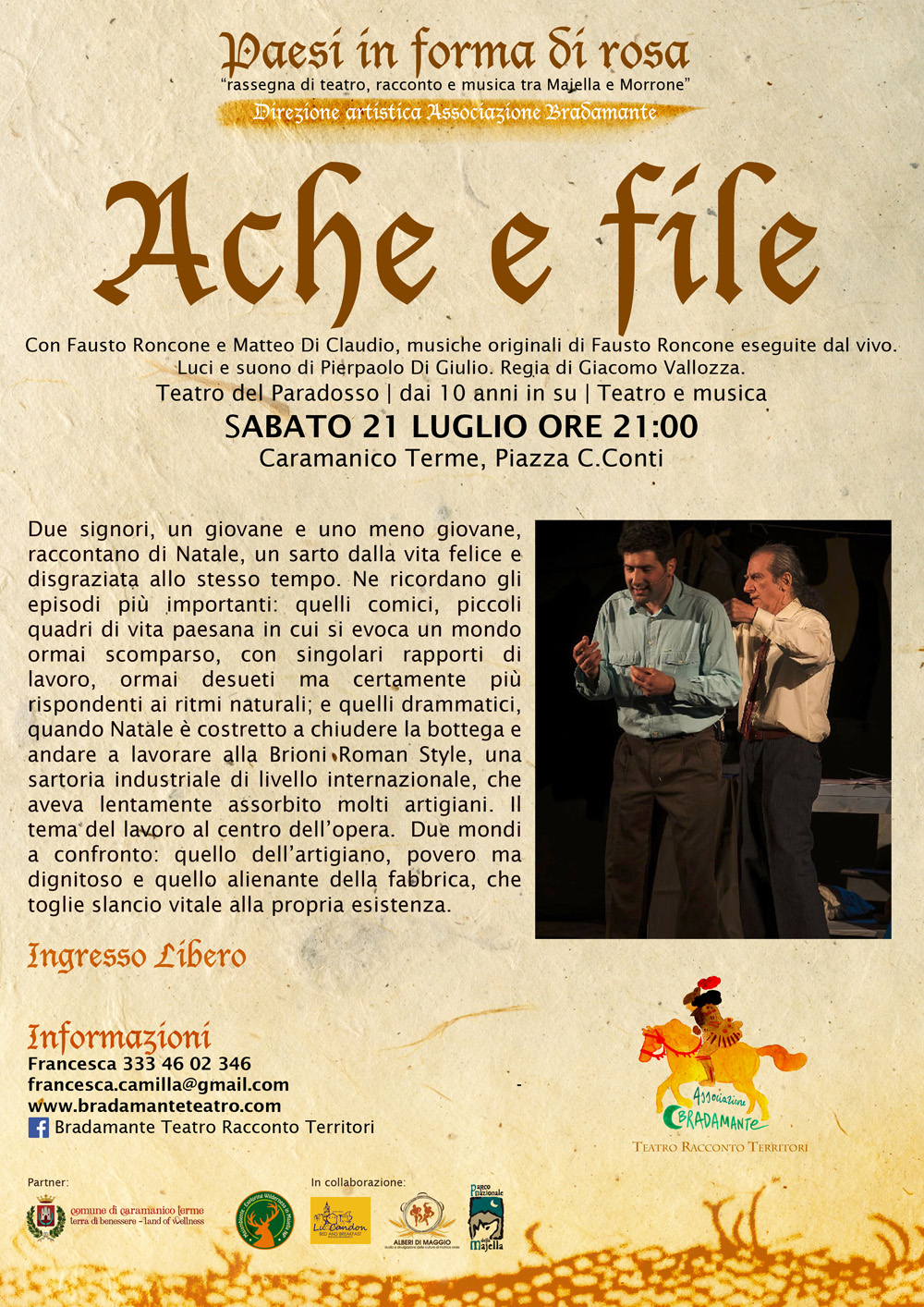 "Io sono una forza del Passato. Solo nella tradizione è il mio amore. Vengo dai ruderi, dalle chiese, dalle pale d´altare, dai borghi abbandonati sugli Appennini o le Prealpi.." scriveva Pasolini nella sua raccolta "Poesia in forma di rosa". Dalle riflessioni sui testi di un grande intellettuale del ´900 nasce l´esigenza di trattare tematiche quali il lavoro, la guerra e il fascismo, il rapporto tra gli esseri umani e la natura, le storie di donne, la tradizione orale. Attraverseremo questa memoria condivisa grazie alla partecipazione di artsiti come Federica Molteni che, con Luna e Gnac Teatro, verrà da Bergamo a raccontarci, per la prima volta in Abruzzo, di Gino Bartali, di cui sono note le grandi imprese sportive ma molto meno le vicende personali e le scelte umane che lo portarono a compiere la più grande delle sue imprese; sarà con noi il Teatro del Paradosso, un pezzo di storia del teatro in Abruzzo che, attraverso il racconto della vita di un sarto, narrerà la trasformazione del mestiere artigianale e l´inesorabile incedere del neocapitalismo, con l´avvento delle fabbriche e la scomparsa di molti mestieri nei piccoli centri; prima volta in terra d´Abruzzo anche per Luigi D´Elia, narratore che con le sue storie gira l´italia e l´Europa, che si fermerà qui nella via dei lupi con un racconto di rara bellezza e poesia: con gli occhi di un bambino che ha fretta di crescere, ci trasporterà nella grande foresta e nella storia dell´ultimo lupo del Salento. Tornano a Roccacaramanico le storie di donne dalla Majella al Gran Sasso, divenuto ormai un appuntamento fisso per non dimenticare la straordinaria forza e dolcezza delle nostre antenate che hanno vissuto e camminato sulle nostre montagne. Chiuderemo la rassegna con la fertile collaborazione con Massimiliano Di Carlo, musicista e ricercatore, che darà vita alla creazione di uno spazio evocativo in cui il suono della voce narrata e quella cantata trasformeranno un´antica aia in un luogo di ricerca e condivisione di storie, memorie e canti provenienti dal mondo agropastorale, nel paese degli scalpellini e dei pastori della Majella.
