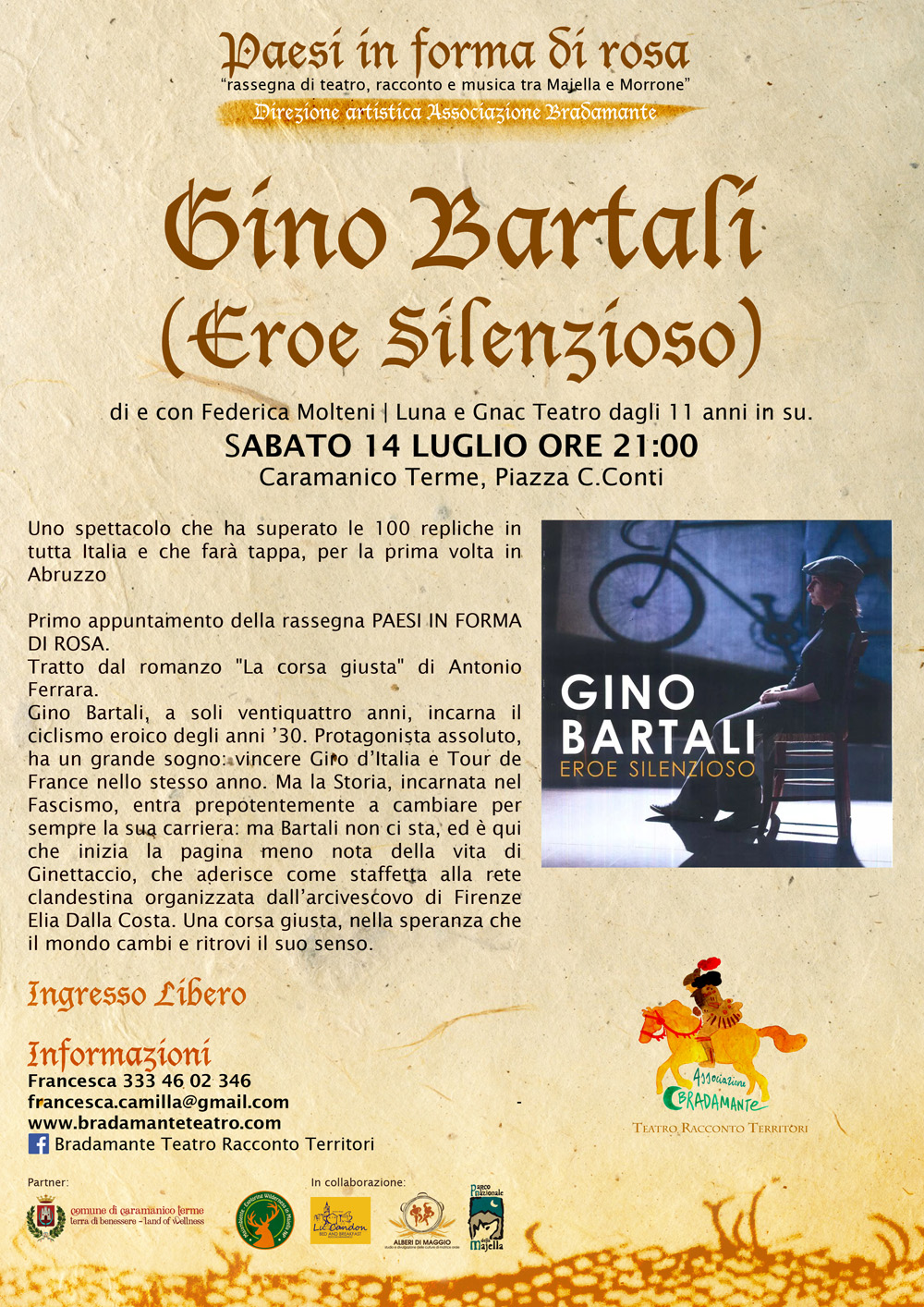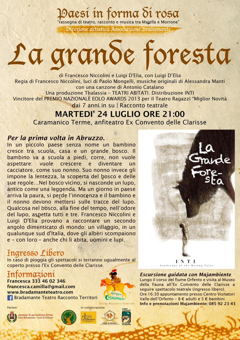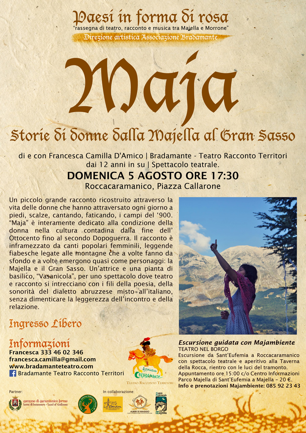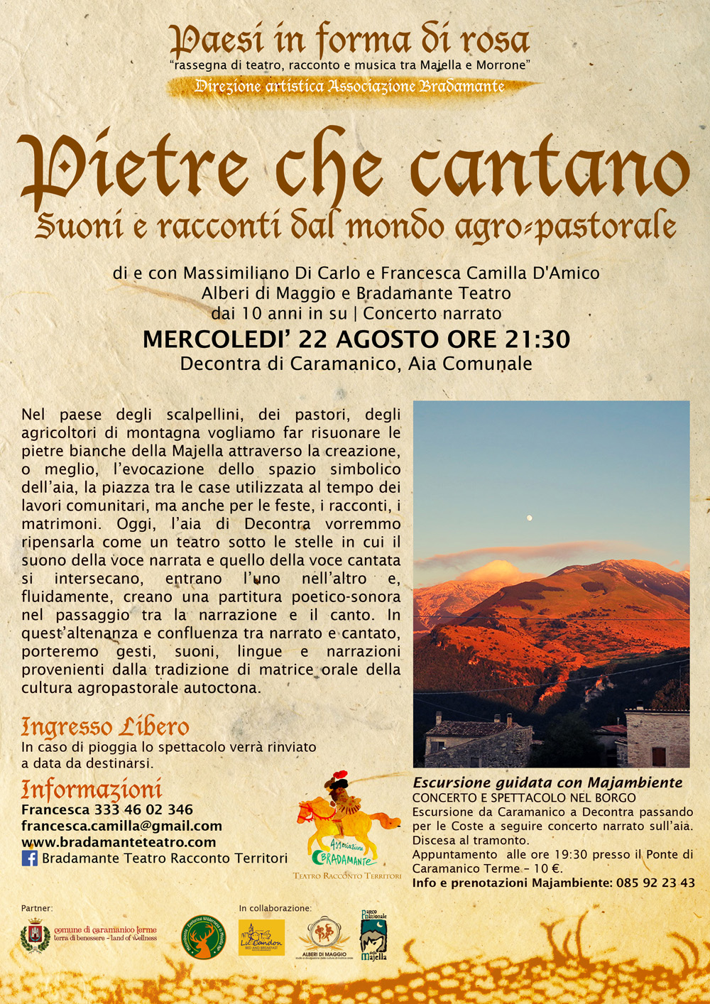 Un bel viaggio si, che ho il piacere di organizzare per la prima volta con Bradamante - Teatro Racconto Territori - un´associazione errante che intende vivere, raccontare e abitare i territori dimenticati. Circondati dalla prorompente natura, nel Parco Nazionale della Majella, abbiamo pensato di abbinare anche escursioni e momenti di educazione ambientale agli spettacoli proposti. Ringraziamo pertanto Majambiente per la preziosa collaborazione e il Comune di Caramanico Terme per sostenere attivamente i nostri passi. Viva il Teatro!